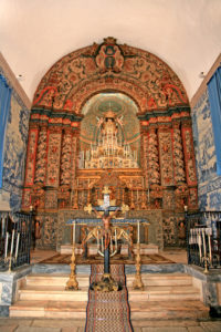 El mayor de los retablos sigue el estilo de los retablos barrocos del período joanino, es decir, retablo expositor, destacando la profundidad. Todo el conjunto interior corresponde a una reforma del siglo XVIII. Completan la obra otros dos retablos laterales, de estilo barroco, dedicados al Pentecostés, policromado en 1777, y a Nuestra Señora de la Misericordia, sin policromar, perfectamente integrados en la azulejería y colocados al mismo tiempo.
