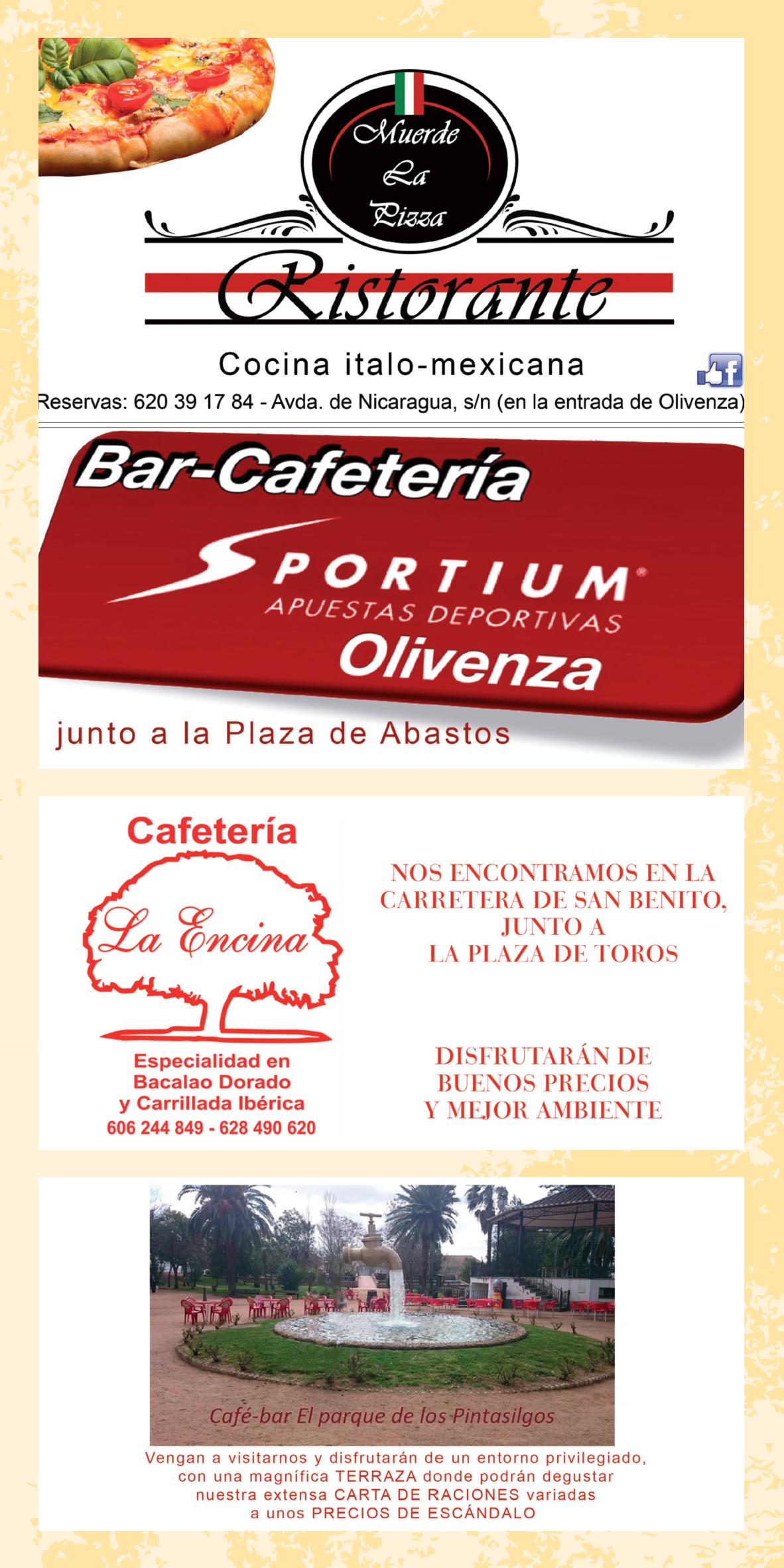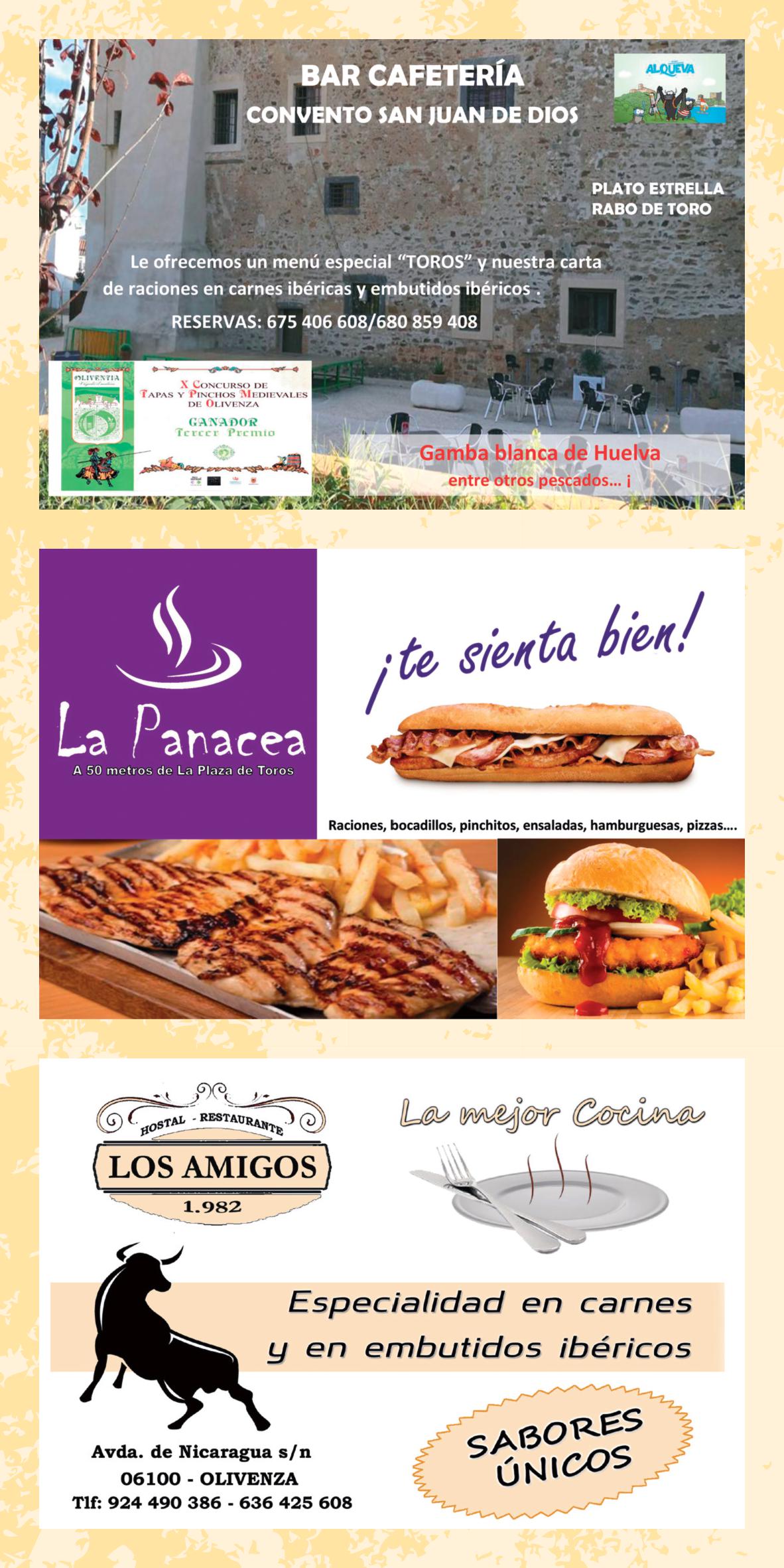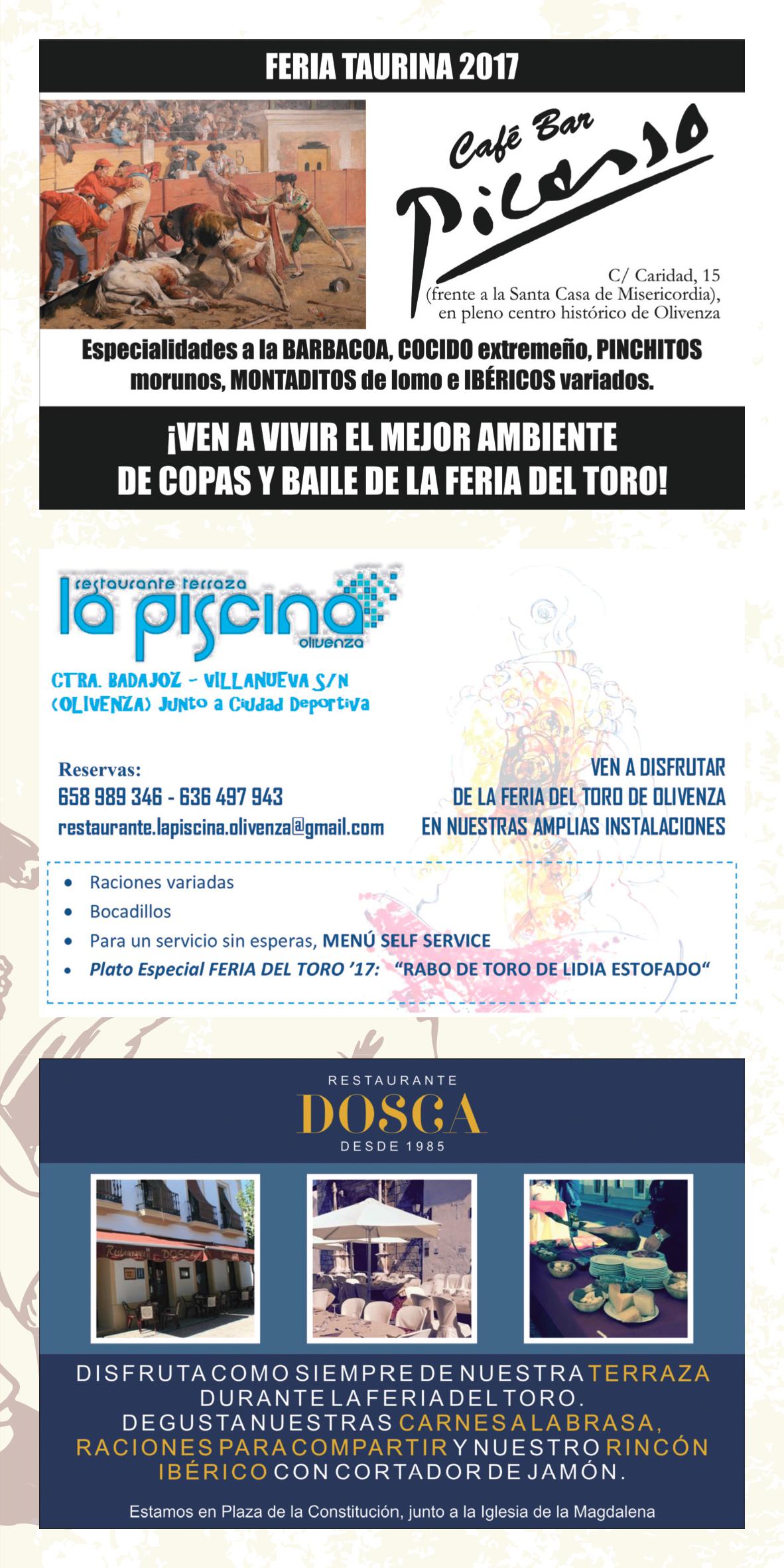 La variada oferta de restauración que Olivenza ofrece a lo largo de todo el año con propuestas que van desde los platos típicos de la región hasta la cocina internacional, pasando por alternativas rápidas como las raciones, bocadillos, etc… se refuerza durante la Feria del Toro con menús especiales o recetas elaboradas con la carne de toro como materia prima.
