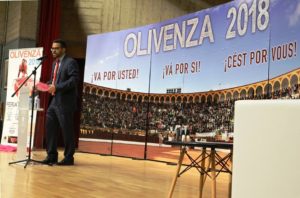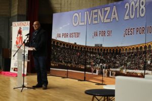 Sobre un fondo en el que se daba las gracias a la afición nacional e internacional, a la que va dedicada esta XXVIII Feria del Toro, con la frase «¡Va por usted!» en español, portugués y francés sobreimpresionadas en una imagen del graderío de la Plaza de Olivenza al completo, se desarrolló un acto en el que el alcalde oliventino, Manuel J. González Andrade, comenzó su intervención destacando que esta feria «mantiene un nivel difícil de mantener» y que se completa con numerosas actividades paralelas.