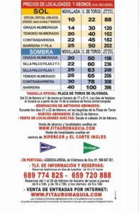 Las taquillas de la Plaza de Toros de Olivenza se abrirán el 21 de febrero, día en el que se podrá hacer la renovación de antiguos abonados; los días 22 y 23 de febrero será el plazo para los nuevos abonados y a partir del día 24 se venderán las localidades sueltas. A partir de mañana se pueden realizar reservas en los teléfonos 689 774 825, 659 720 888 o por correo electrónico reservas@fitauromaquia.com. Para más información, consultar la página web www.fitauromaquia.com.