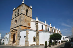 En su exterior destacan falsas almenas, pináculos, gárgolas, puertas laterales y la puerta principal –con una portada añadida posteriormente-, atribuida a Nicolás de Chanterenne. Este artista de origen francés realizó en Portugal otros importantes trabajos como la puerta de la iglesia del monasterio de los Jerónimos de Lisboa o un retablo de mármol en el Palácio da Pena de Sintra, aparte de otros trabajos en el Alentejo.