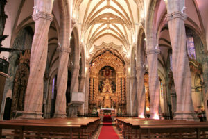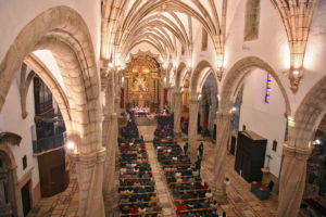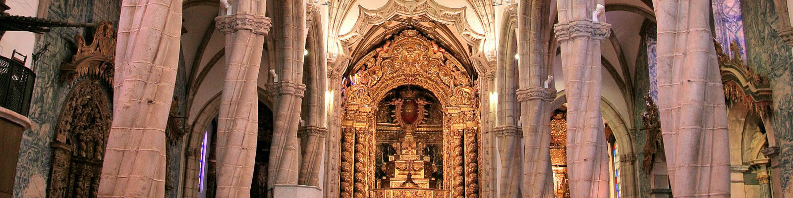 n tres naves por ocho formidables columnas torsas que parecen evocar los calabrotes de un navío. El francés Boytac, y tal vez Diego o Francisco de Arruda, fueron los creadores de este espacio mágico donde el espíritu se siente envuelto por un movimiento que es también reposo. Presenta asimismo retablos de talla dorada del XVIII, retablos neoclásicos en mármol de colores y azulejería historiada.