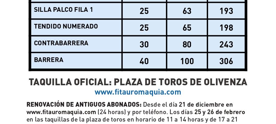 NUEVOS ABONADOS: Desde el día 21 de diciembre en www.fitauromaquia.com y en los teléfonos: 689 774 825 Y 659 720 888. El 27 de febrero en las taquillas de la plaza de toros en horario de 11 a 14 horas y de 17 a 21 horas.